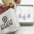 Een elegante minimalistische set van een collier en bijpassende oorbellen, beide met de frisse, zachte uitstraling van aquamarijn.